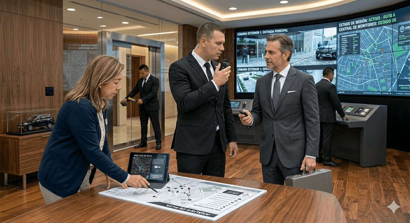 Disponemos de sistemas de comunicación encriptada, botones de pánico, vehículos de reacción y coordinación con central de monitoreo. Cada servicio incluye un análisis previo de rutinas, desplazamientos y puntos de riesgo.
